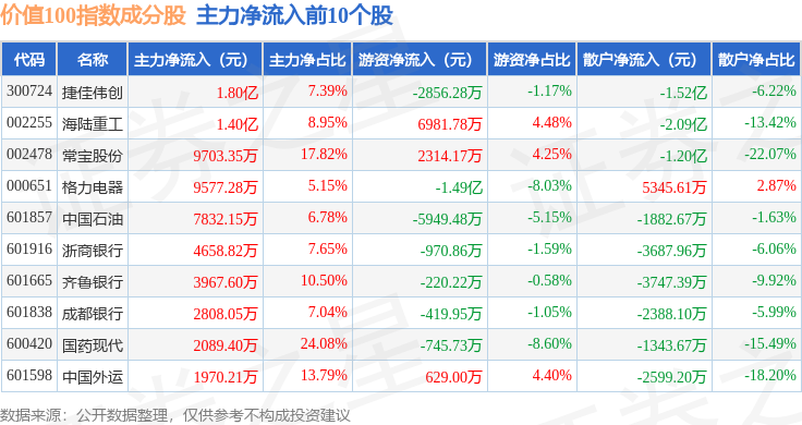 资金流向方面,价值100(980081)指数成份股当日主力资金净流出合计14.5亿元,游资资金净流入合计2.54亿元,散户资金净流入合计12.04亿元。成份股资金流向详情见下表: