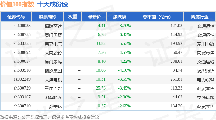 证券之星消息,12月11日,价值100(980081)指数报收于4329.49点,跌0.42%,成交433.89亿元,换手率0.65%。当日该指数成份股中,上涨的有28家,陕鼓动力以3.74%的涨幅领涨,下跌的有69家,福建高速以8.7%的跌幅领跌。