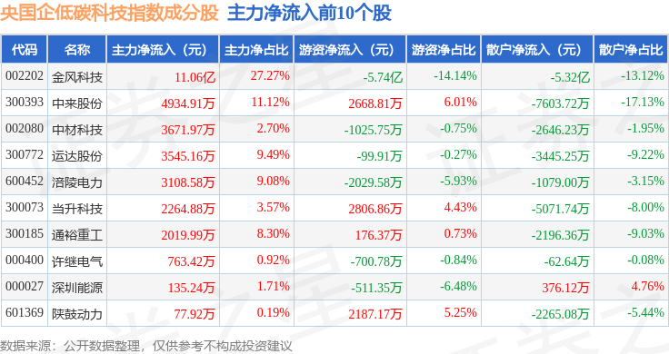 资金流向方面,央国企低碳科技(980082)指数成份股当日主力资金净流出合计1.86亿元,游资资金净流出合计2.01亿元,散户资金净流入合计3.88亿元。成份股资金流向详情见下表: