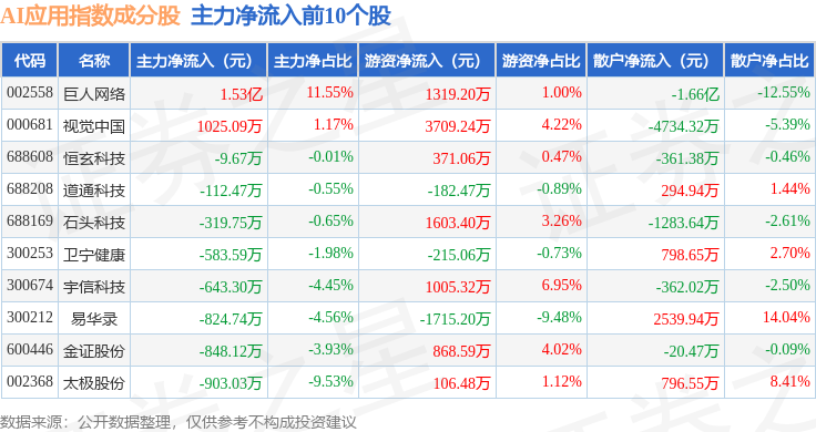 资金流向方面,AI应用(980112)指数成份股当日主力资金净流出合计35.5亿元,游资资金净流入合计7.02亿元,散户资金净流入合计28.47亿元。成份股资金流向详情见下表: