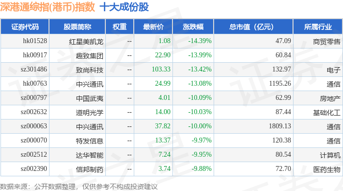 深港通综指(港币)(983006)指数十大成份股详情如下: