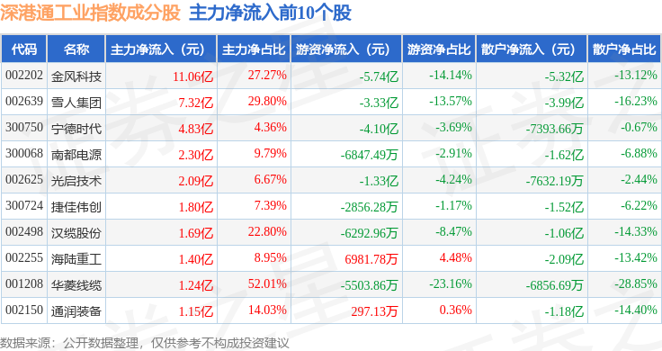 资金流向方面,深港通工业(983017)指数成份股当日主力资金净流出合计54.26亿元,游资资金净流入合计9.9亿元,散户资金净流入合计44.37亿元。成份股资金流向详情见下表: