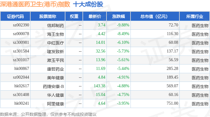 深港通医药卫生(港币)(983024)指数十大成份股详情如下: