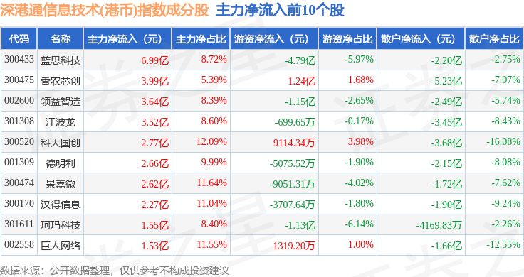 资金流向方面,深港通信息技术(港币)(983028)指数成份股当日主力资金净流出合计121.28亿元,游资资金净流入合计22.21亿元,散户资金净流入合计99.06亿元。成份股资金流向详情见下表: