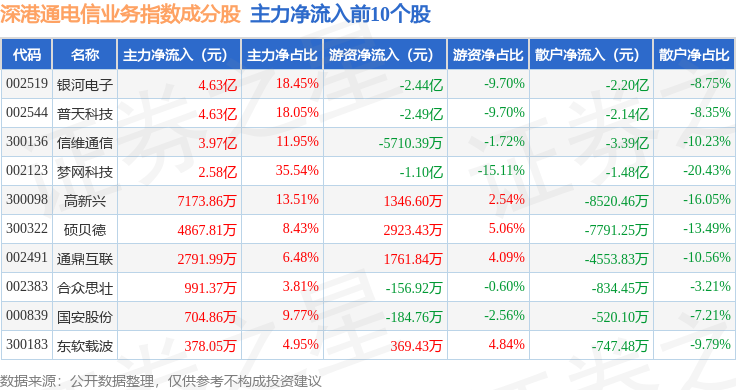 资金流向方面,深港通电信业务(983029)指数成份股当日主力资金净流出合计117.09亿元,游资资金净流入合计41.98亿元,散户资金净流入合计75.11亿元。成份股资金流向详情见下表: