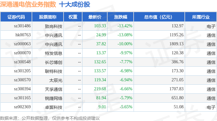 证券之星消息,12月11日,深港通电信业务(983029)指数报收于10532.14点,跌2.5%,成交1422.54亿元,换手率2.04%。当日该指数成份股中,上涨的有12家,银河电子以10.08%的涨幅领涨,下跌的有61家,致尚科技以13.42%的跌幅领跌。