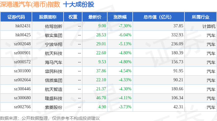 深港通汽车(港币)(983040)指数十大成份股详情如下: