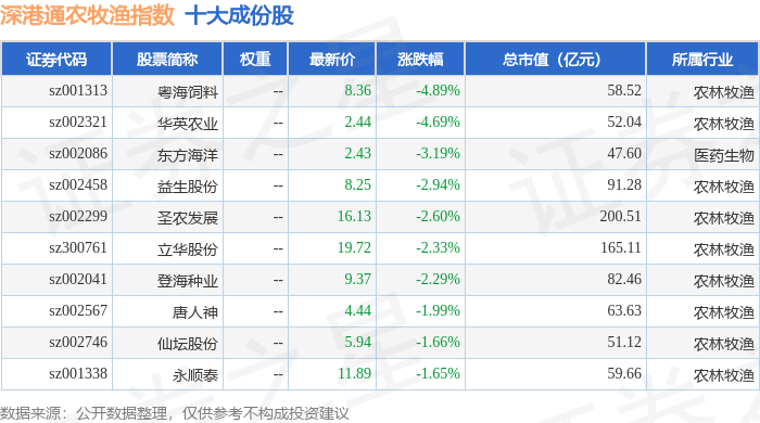 深港通农牧渔(983051)指数十大成份股详情如下: