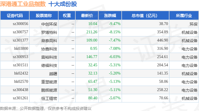 证券之星消息,12月11日,深港通工业品(983069)指数报收于6273.78点,跌0.5%,成交1736.24亿元,换手率2.49%。当日该指数成份股中,上涨的有75家,迈为股份以12.82%的涨幅领涨,下跌的有235家,中创环保以9.47%的跌幅领跌。