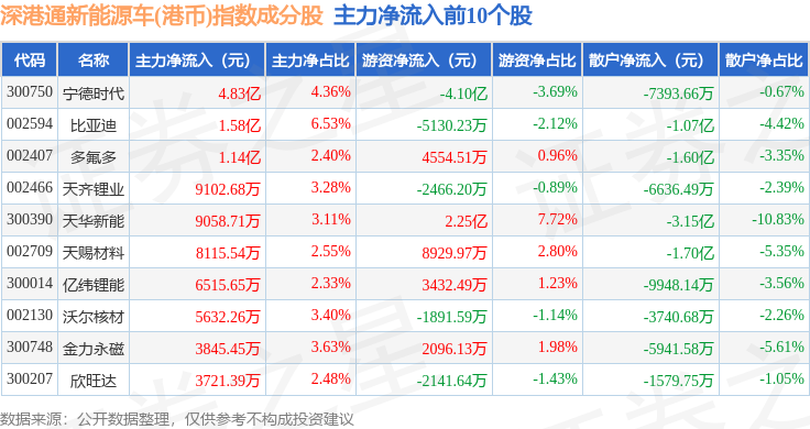 资金流向方面,深港通新能源车(港币)(983088)指数成份股当日主力资金净流出合计13.26亿元,游资资金净流入合计6.83亿元,散户资金净流入合计6.43亿元。成份股资金流向详情见下表: