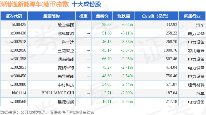 深港通新能源车(港币)(983088)指数十大成份股详情如下: