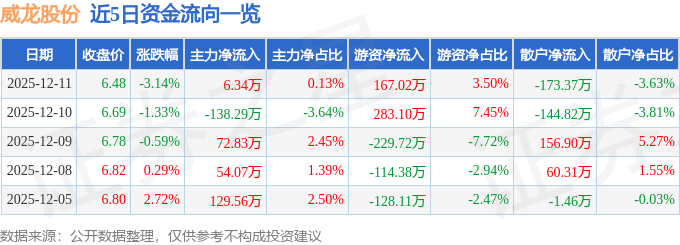 证券之星消息,截至2025年12月11日收盘,威龙股份(603779)报收于6.48元,下跌3.14%,换手率2.2%,成交量7.3万手,成交额4774.43万元。
