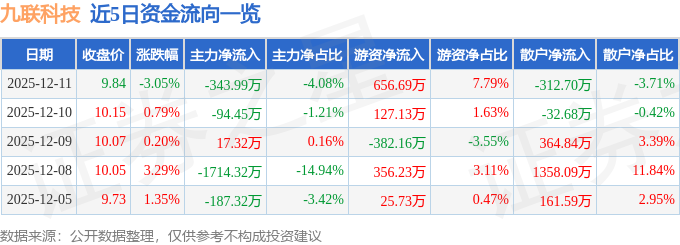证券之星消息,截至2025年12月11日收盘,九联科技(688609)报收于9.84元,下跌3.05%,换手率1.69%,成交量8.47万手,成交额8428.71万元。