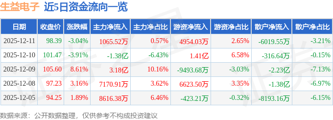 证券之星消息,截至2025年12月11日收盘,生益电子(688183)报收于98.39元,下跌3.04%,换手率2.22%,成交量18.48万手,成交额18.73亿元。