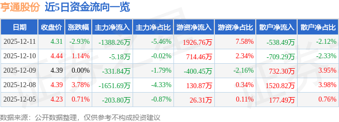 证券之星消息,截至2025年12月11日收盘,亨通股份(600226)报收于4.31元,下跌2.93%,换手率1.95%,成交量58.01万手,成交额2.54亿元。