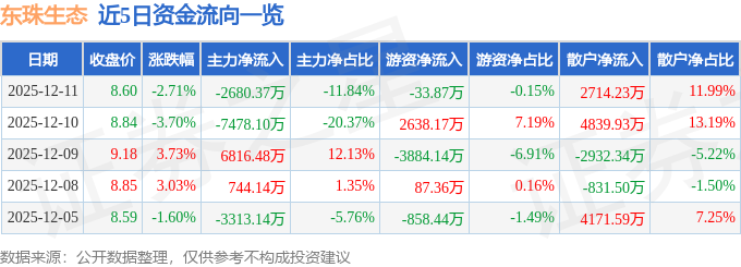 证券之星消息,截至2025年12月11日收盘,东珠生态(603359)报收于8.6元,下跌2.71%,换手率5.84%,成交量26.03万手,成交额2.26亿元。