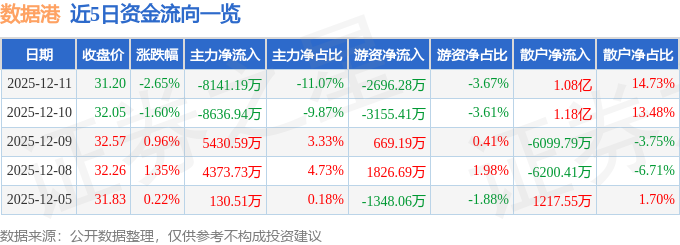 证券之星消息,截至2025年12月11日收盘,数据港(603881)报收于31.2元,下跌2.65%,换手率3.23%,成交量23.24万手,成交额7.36亿元。