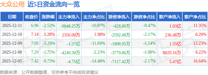 证券之星消息,截至2025年12月11日收盘,大众公用(600635)报收于6.96元,下跌2.52%,换手率5.34%,成交量129.24万手,成交额9.06亿元。