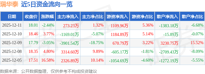 证券之星消息,截至2025年12月11日收盘,瑞华泰(688323)报收于18.01元,下跌2.44%,换手率6.24%,成交量11.23万手,成交额2.07亿元。