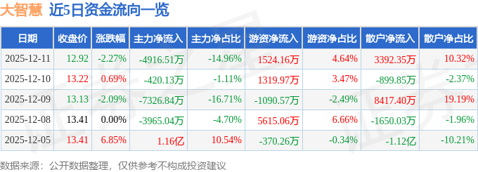证券之星消息,截至2025年12月11日收盘,大智慧(601519)报收于12.92元,下跌2.27%,换手率1.27%,成交量25.21万手,成交额3.29亿元。