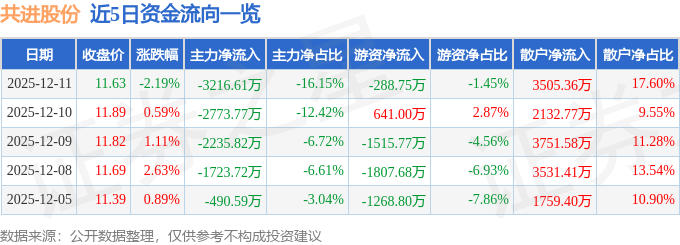 12月11日的资金流向数据方面,主力资金净流出3216.61万元,占总成交额16.15%,游资资金净流出288.75万元,占总成交额1.45%,散户资金净流入3505.36万元,占总成交额17.6%。
