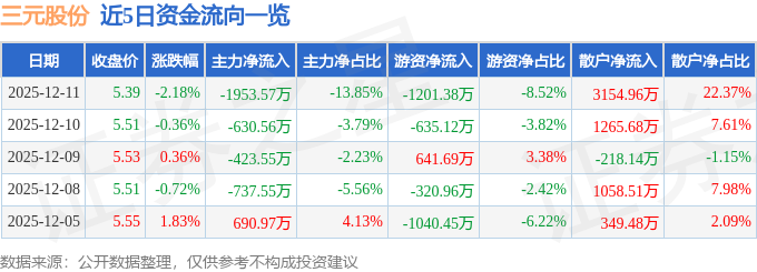 证券之星消息,截至2025年12月11日收盘,三元股份(600429)报收于5.39元,下跌2.18%,换手率1.74%,成交量26.05万手,成交额1.41亿元。