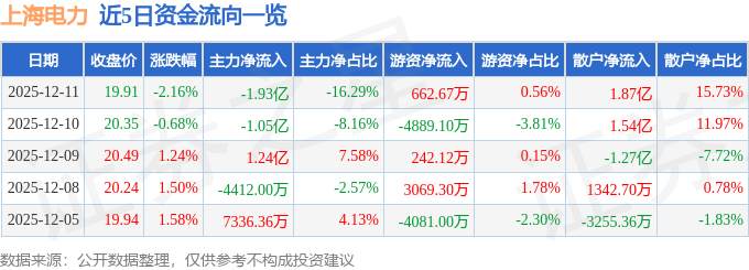 证券之星消息,截至2025年12月11日收盘,上海电力(600021)报收于19.91元,下跌2.16%,换手率2.08%,成交量58.78万手,成交额11.87亿元。