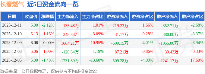 证券之星消息,截至2025年12月11日收盘,长春燃气(600333)报收于6.0元,下跌2.12%,换手率3.61%,成交量21.98万手,成交额1.32亿元。