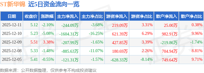 证券之星消息,截至2025年12月11日收盘,ST新华锦(600735)报收于5.12元,下跌2.1%,换手率3.04%,成交量12.92万手,成交额6625.53万元。