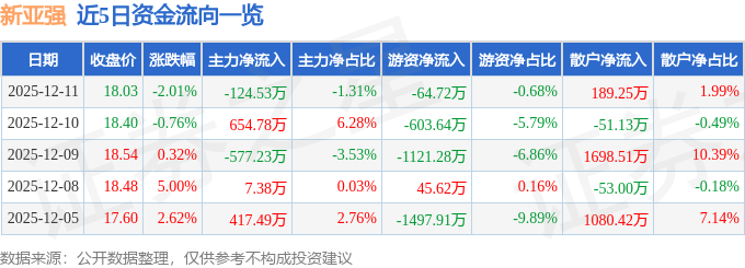 证券之星消息,截至2025年12月11日收盘,新亚强(603155)报收于18.03元,下跌2.01%,换手率1.65%,成交量5.22万手,成交额9508.74万元。