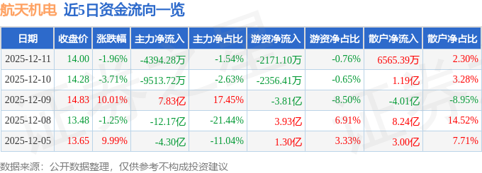 证券之星消息,截至2025年12月11日收盘,航天机电(600151)报收于14.0元,下跌1.96%,换手率14.13%,成交量202.69万手,成交额28.51亿元。