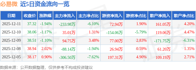 12月11日的资金流向数据方面,主力资金净流出233.98万元,占总成交额6.1%,游资资金净流入72.94万元,占总成交额1.9%,散户资金净流入161.05万元,占总成交额4.2%。
