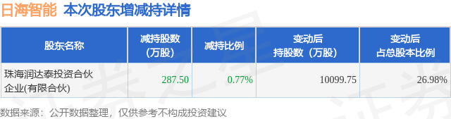 证券之星消息,12月11日日海智能发布公告《日海智能:关于持股5%以上股东减持股份触及1%整数倍的公告》,其股东珠海润达泰投资合伙企业(有限合伙)于2025年11月10日至2025年12月10日间合计减持287.5万股,占公司目前总股本的0.7679%,变动期间该股股价下跌0.18%,截止12月10日收盘报10.94元。
