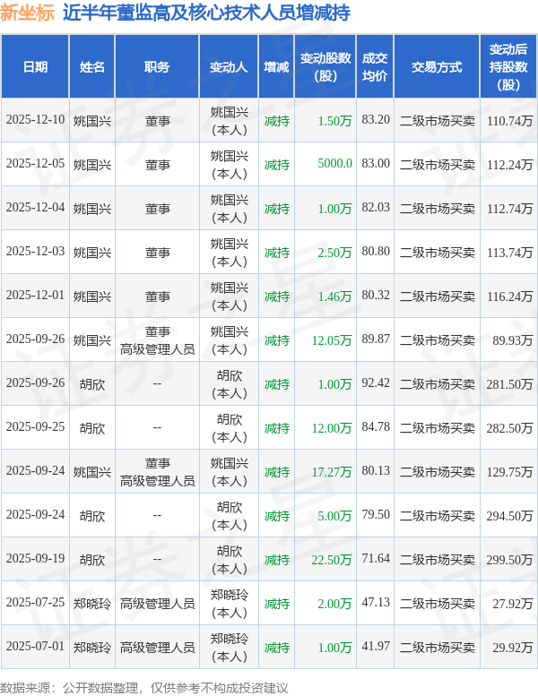 新坐标近半年内的董监高及核心技术人员增减持详情如下: