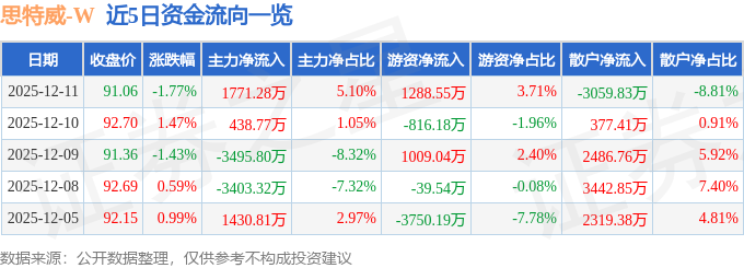 12月11日的资金流向数据方面,主力资金净流入1771.28万元,占总成交额5.1%,游资资金净流入1288.55万元,占总成交额3.71%,散户资金净流出3059.83万元,占总成交额8.81%。