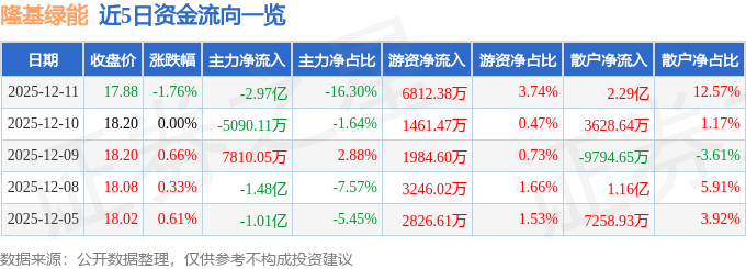 证券之星消息,截至2025年12月11日收盘,隆基绿能(601012)报收于17.88元,下跌1.76%,换手率1.33%,成交量100.94万手,成交额18.22亿元。