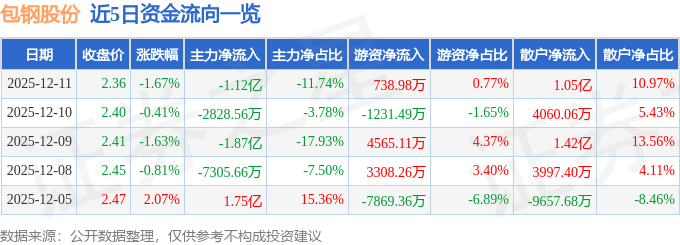 证券之星消息,截至2025年12月11日收盘,包钢股份(600010)报收于2.36元,下跌1.67%,换手率1.28%,成交量400.48万手,成交额9.55亿元。