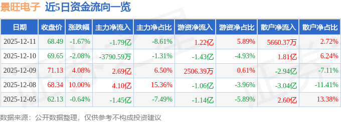 证券之星消息,截至2025年12月11日收盘,景旺电子(603228)报收于68.49元,下跌1.67%,换手率3.09%,成交量30.2万手,成交额20.79亿元。