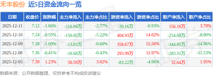 证券之星消息,截至2025年12月11日收盘,禾丰股份(603609)报收于7.12元,下跌1.66%,换手率0.65%,成交量5.92万手,成交额4223.48万元。