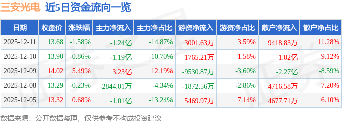 证券之星消息,截至2025年12月11日收盘,三安光电(600703)报收于13.68元,下跌1.58%,换手率1.21%,成交量60.34万手,成交额8.35亿元。
