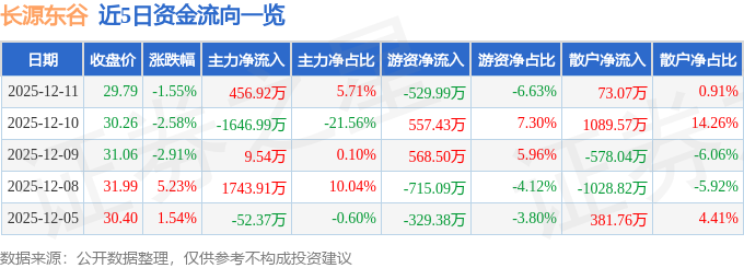 证券之星消息,截至2025年12月11日收盘,长源东谷(603950)报收于29.79元,下跌1.55%,换手率0.83%,成交量2.68万手,成交额7996.69万元。