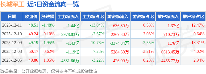 证券之星消息,截至2025年12月11日收盘,长城军工(601606)报收于48.51元,下跌1.48%,换手率3.12%,成交量22.61万手,成交额11.03亿元。