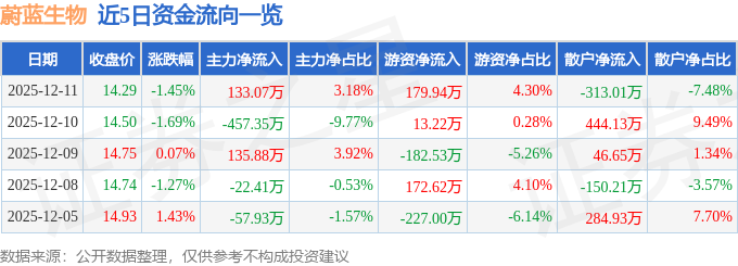 证券之星消息,截至2025年12月11日收盘,蔚蓝生物(603739)报收于14.29元,下跌1.45%,换手率1.15%,成交量2.91万手,成交额4184.02万元。