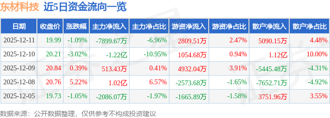 证券之星消息,截至2025年12月11日收盘,东材科技(601208)报收于19.99元,下跌1.09%,换手率5.45%,成交量55.51万手,成交额11.36亿元。