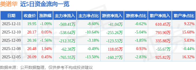 12月11日的资金流向数据方面,主力资金净流出569.41万元,占总成交额8.6%,游资资金净流出41.04万元,占总成交额0.62%,散户资金净流入610.45万元,占总成交额9.22%。