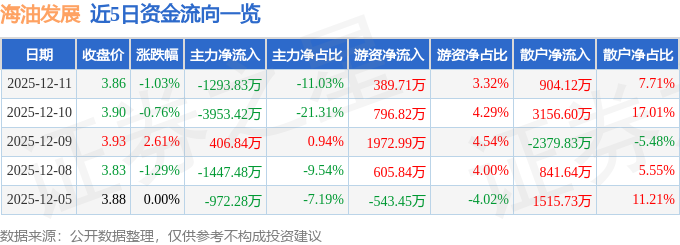 证券之星消息,截至2025年12月11日收盘,海油发展(600968)报收于3.86元,下跌1.03%,换手率0.3%,成交量30.27万手,成交额1.17亿元。