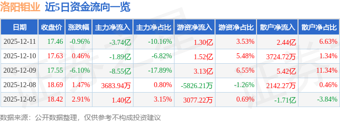 证券之星消息,截至2025年12月11日收盘,洛阳钼业(603993)报收于17.46元,下跌0.96%,换手率1.19%,成交量207.75万手,成交额36.84亿元。