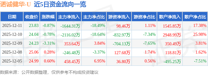 证券之星消息,截至2025年12月11日收盘,诺诚健华(688428)报收于23.83元,下跌0.87%,换手率1.39%,成交量3.72万手,成交额8893.5万元。