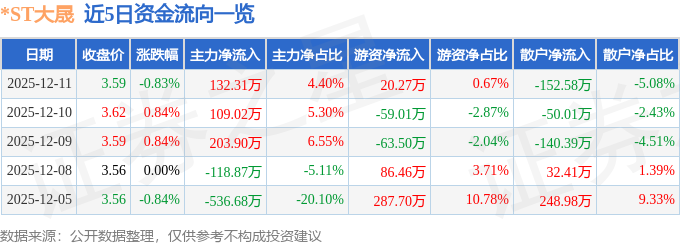 证券之星消息,截至2025年12月11日收盘,*ST大晟(600892)报收于3.59元,下跌0.83%,换手率1.48%,成交量8.29万手,成交额3006.23万元。