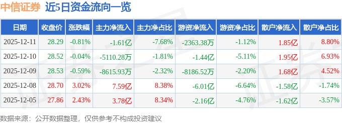 证券之星消息,截至2025年12月11日收盘,中信证券(600030)报收于28.29元,下跌0.81%,换手率0.61%,成交量74.23万手,成交额21.03亿元。